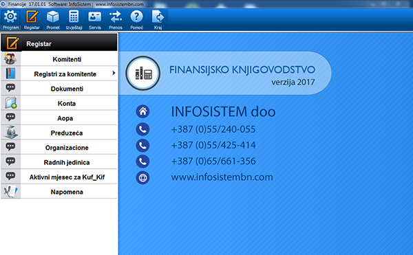 Program omogućava kompletnu evidenciju finansijskog knjigovodstva. Može da se koristi samostalno ili u zajedno sa programom za robno knjigovodstvo. Ukoliko se koristi sa programom za robno knjigovodstvo na raspolaganju nam je mogućnost da na osnovu unaprijed podešene šeme knjiženja dokumente iz robnog automatski proknjižimo u finanijsko knjigovodstvo.