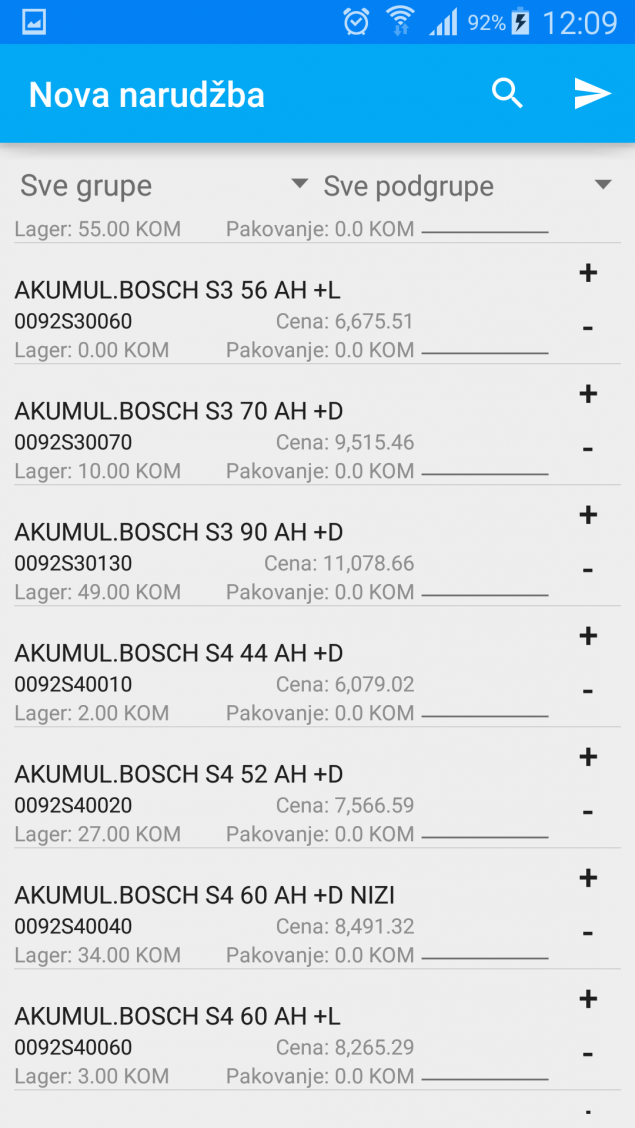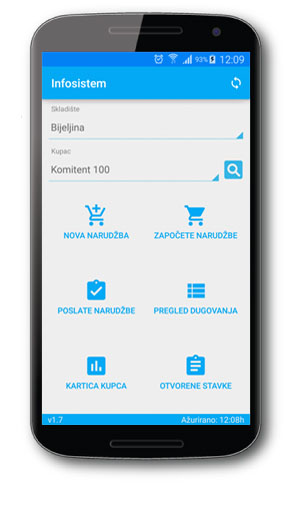 Aplikacija za komercijaliste se koristi za daljinsko naručivanje robe. Na početku potrebno je izabrati magacin sa koga se skida roba, za kog kupca i koju poslovnu jedinicu. Biranjem opcije nova narudžba otvara lista sa prikazom svih artikala. Prikazan je naziv artikla, šifra, količina na lageru, cijena sa pdv-om i jedinica mjere. Izborom određenog artikla otvara se prozor sa prikazanim količinama na svim skladištima. Nakon što se odaberu artikli narudžba se klikom na dugme u desnom gornjem uglu pošalje.