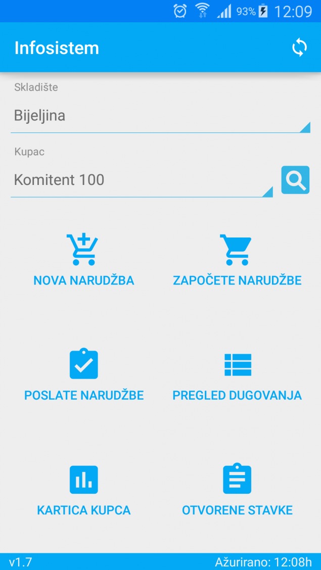 Application for sales is used for remote ordering merchandise. At the beginning it is necessary to choose the warehouse from which the goods are removed, for which buyer and what business unit. Selecting new order opens the list showing all items. Below is the product name, code, quantity in stock, the price including VAT and units of measure. By selecting the item it opens a window with the indicated amounts in all warehouses. Once the items are selected, click on the button in the upper right corner to send orders.